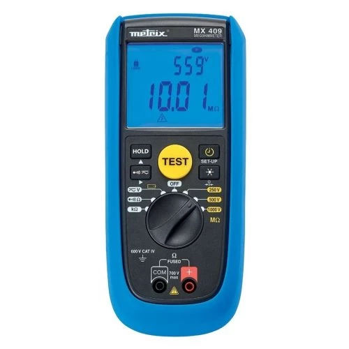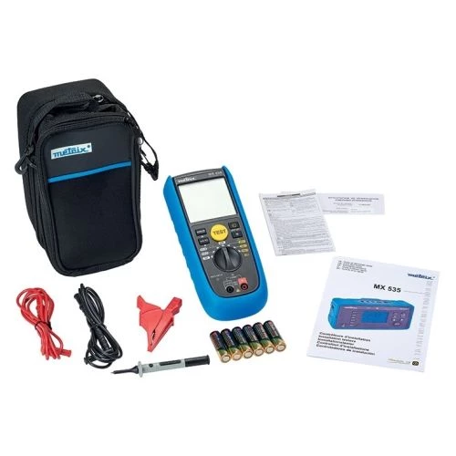 Le contrôleur d’isolement MX 409 de la marque Chauvin Arnoux convient aux interventions de maintenance, de réparation d’équipements électriques tels que les moteurs, les câbles. Grâce à sa sacoche »mains libres », le contrôleur d’isolement MX 409 s’utilise sans contraintes sur le terrain. La gaine antichoc avec béquille assure une stabilité sur plan horizontal. L’écran LCD permet la visualisation simultanée de la valeur d’isolement et de la tension d’essai réelle grâce à son double afficheur. Le rétro-éclairage permet une lisibilité en toutes circonstances. Le mégohmmètre MX 409 réalise les mesures de résistance, d’isolement et de continuité selon les normes internationales en vigueur. La mesure de continuité intègre la compensation des cordons. La mesure d’isolement est possible en mode manuel, verrouillé ou à durée programmée grâce au timer. En mesure de tension, un indicateur affiche l’état des piles. Le MX 409 indique instantanément les résultats des tests : l’écran devient rouge en cas de dépassement de seuil. La présence de tension dangereuse (>30 V) est détectée automatiquement par le MX 409 rendant le test d’isolement impossible.
