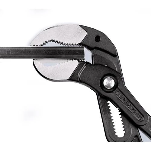 La pince multiprise et clé serre-tubes COBRA® de Knipex permet un réglage rapide et précis pour un ajustage parfait quelque soit la taille des pièces. Elle est autobloquante sur les tubes et les écrous et permet un travail sans fatigue. Cette pince dispose des dents spécialement trempées à l’intérieur des mâchoires pour un serrage sûr et performant.