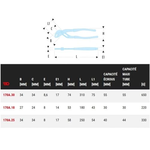 Cette pince multiprise standard 170A de Facom dispose de branches spatulées pour un bon confort d’utilisation. Elle dispose d’une denture autoserrante.